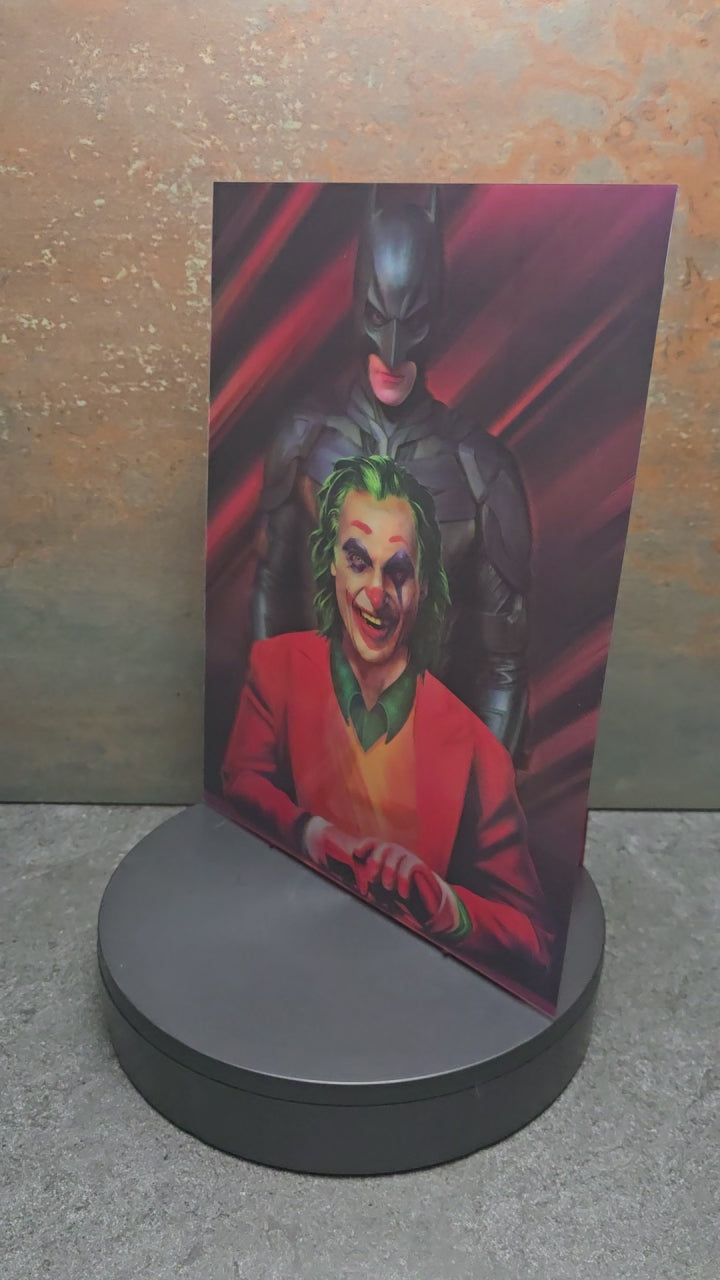 Dieses einzigartige 3D Lentikularbild zeigt Batman mit 3 verschiedenen Versionen seines Erzfeindes Joker - das ikonische Duo aus Gotham City! Je nach Blickwinkel wechselt das Motiv zwischen den drei Joker-Versionen - ein faszinierender Effekt, der jeden DC Comics-Fan begeistert!