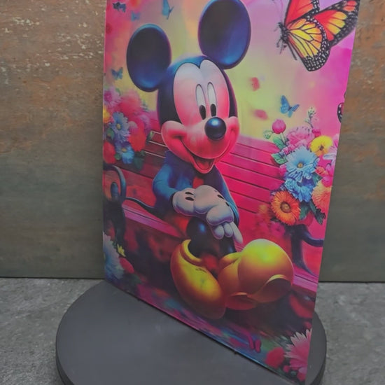 Dieses einzigartige 3D Lentikularbild zeigt den beliebten Disney-Charakter Mickey Mouse in 3 verschiedenen bunten, fröhlichen Szenen voller Farben, Blumen, Schmetterlinge und Seifenblasen. Je nach Blickwinkel wechselt das Motiv - ein faszinierender Effekt, der jeden Disney-Fan begeistert!