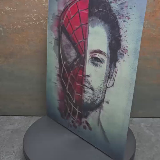 Dieses einzigartige 3D Lentikularbild zeigt drei legendäre Spider-Man Schauspieler in einer künstlerischen Darstellung mit halben Gesichtern und halben Masken: