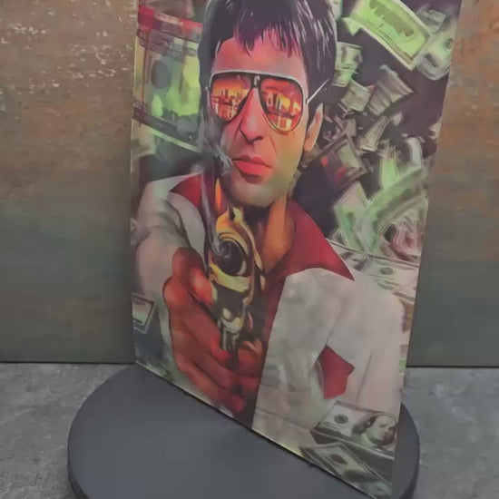 Dieses einzigartige 3D Lentikularbild zeigt die Film-Legende Tony Montana aus Scarface in 3 verschiedenen ikonischen Szenen mit Waffen und Geld. Je nach Blickwinkel wechselt das Motiv - ein faszinierender Effekt, der jeden Film-Fan begeistert!